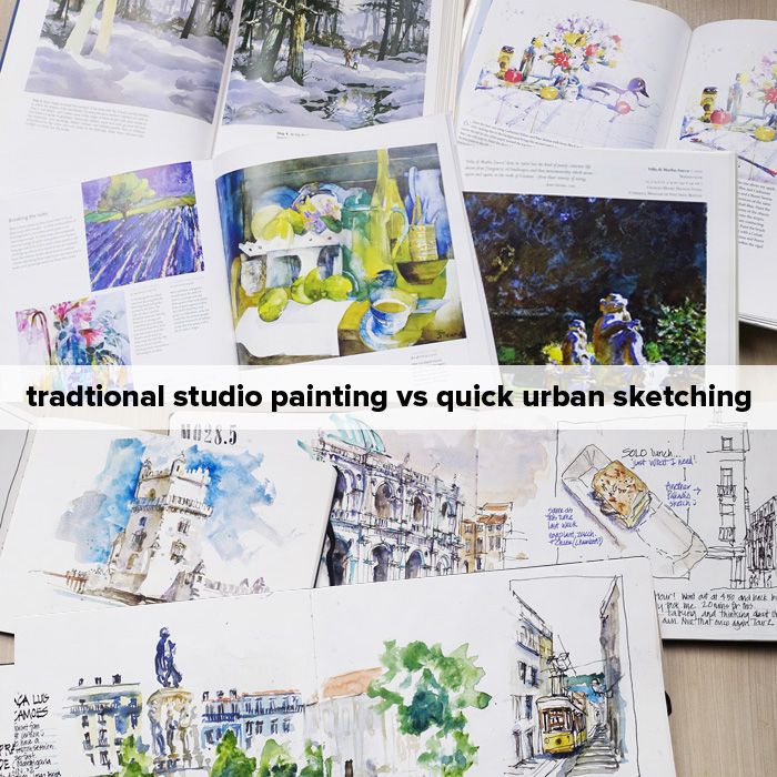 I believe that there is a big difference between using watercolour in a traditional way in the studio and using it out on location for quick sketches.