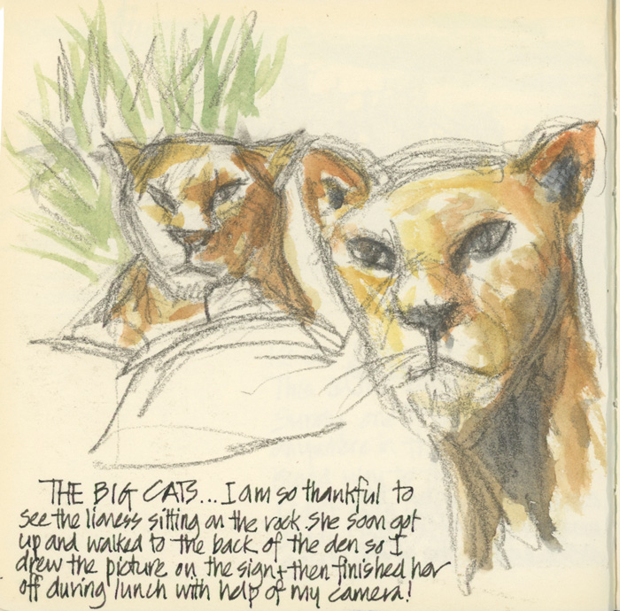 Wow, these are great! You really captured a zoo visit, even the large cat laying there and the lionesses. Just delightful to look at! I liked your sketch of what you took and used.