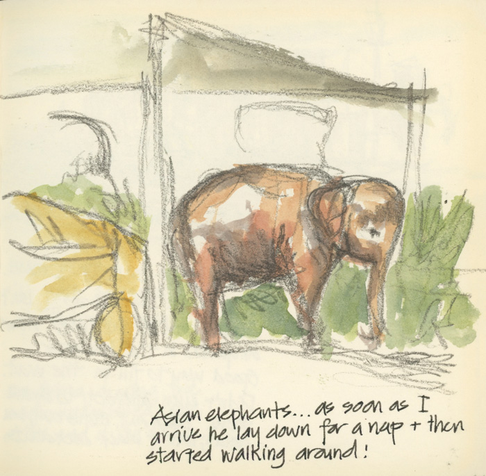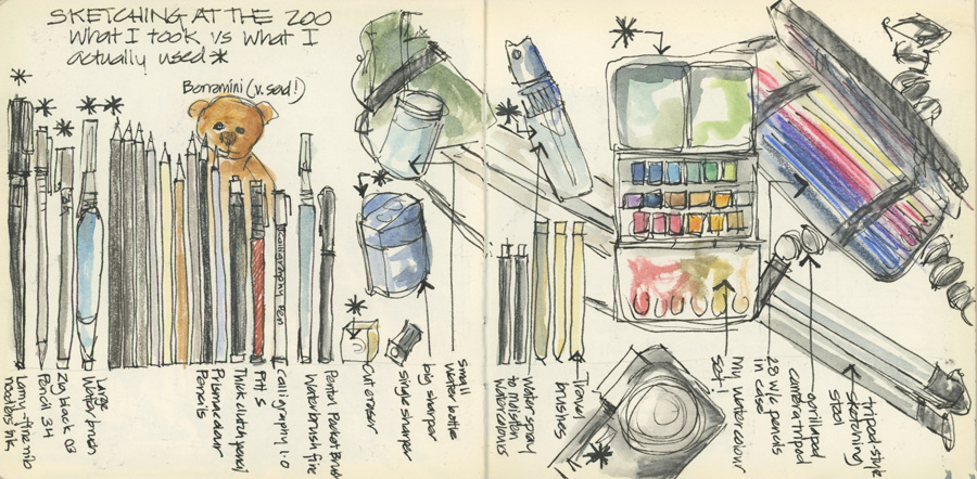 I loved the zoo sketches. I admire anyone who can capture the sense and sights of a place as you did. I smiled at your sketch of supplies you took, I have the habit of taking “everything” just in case! Like you, I use very few out of my arsenal. Thank you for the visit to a zoo I probably will never get to see any other way.