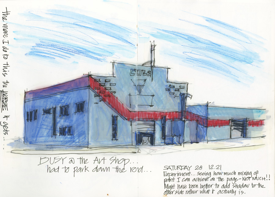 When the headache started to lift I went to The Art Scene and made a mess of a building down the road. I then added another version on Sheer Heaven over the top and changed the direction of the light.