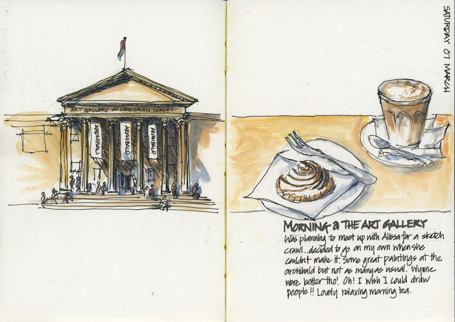 A lovely morning at the Art Gallery – didn’t sketch in the exhibition as too many people but naturally sketched at morning tea. (I always try to get there early before they open up so I can sketch the entrance portico)