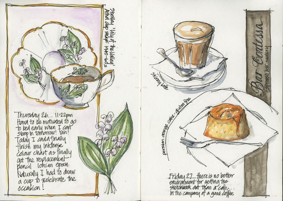 Right side: Best way to get in the mood for a day of solo sketching…. a nice comfy table at a cafe and a good coffee and cake…