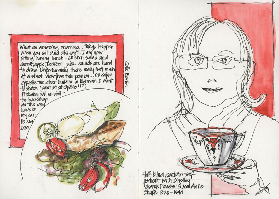 Ok- striking while the iron(I mean cuppa) is hot… Here is an attempt at implementing Rick and Gay’s suggestions on Flickr to draw tea cups and people. Blind Contour self portrait with a collectible cup. I have to admit this was rather fun to do (although a little scary to see it posted!) …. maybe it is the only way that I will be able to break through this barrier of being afraid to draw people.