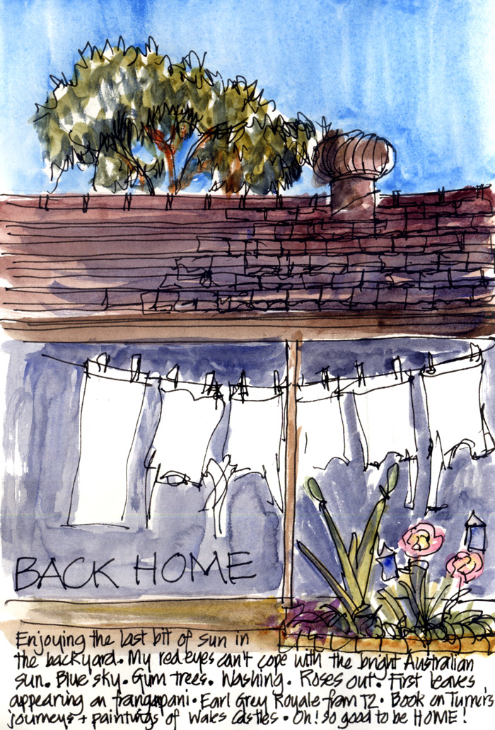 Looks like I am now starting a mini series On Back Home sketches. This one was done on the first afternoon while sitting in the sun in the backyard and starting to fade (due to jet lag) a bit.