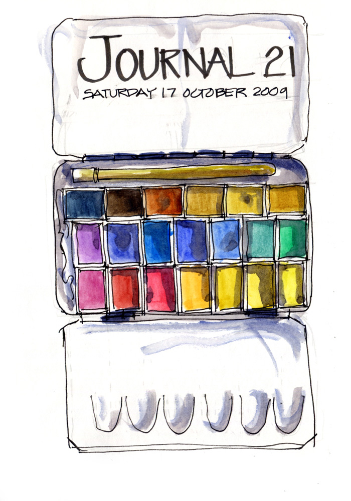 Today I have re-loaded my new (replacement) paint tin and used it as my title page for my latest sketchbook… as I have done previously – this is the one I bought in the next block to Le Select just before we met Rick Tulka (talk about name dropping!)