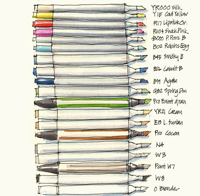 I would never have thought that I would do a title page like this…. markers in a moleskine cahier. BTW 1 please don’t take this palette of markers as a guide, I have already made 2 changes and the pink is NOT right…not sure about the two lightest blues either.