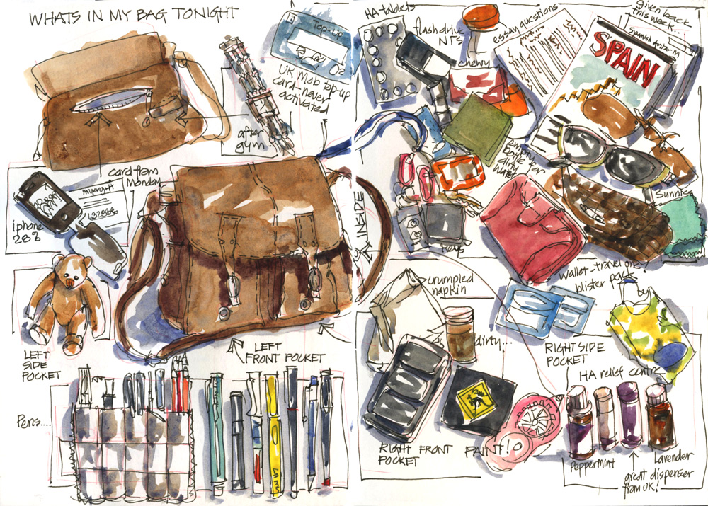 BTW: Just for the record, I haven’t revealed absolutely everything in my bag and a few items are suitably vague. If you are interested in the art supplies in the front two pockets an old photo is here and a new sketch is here…but even that is slightly out of date.