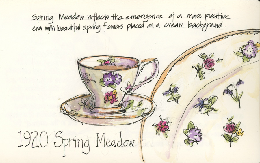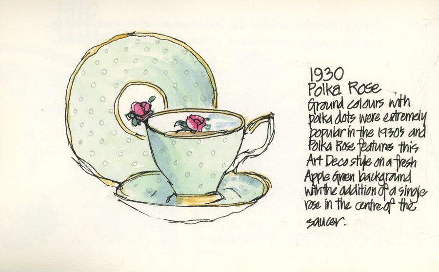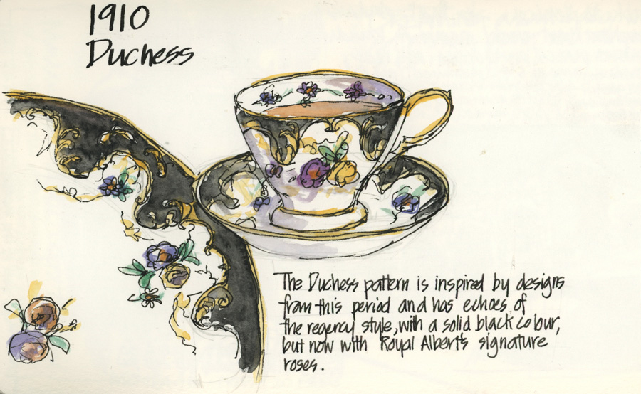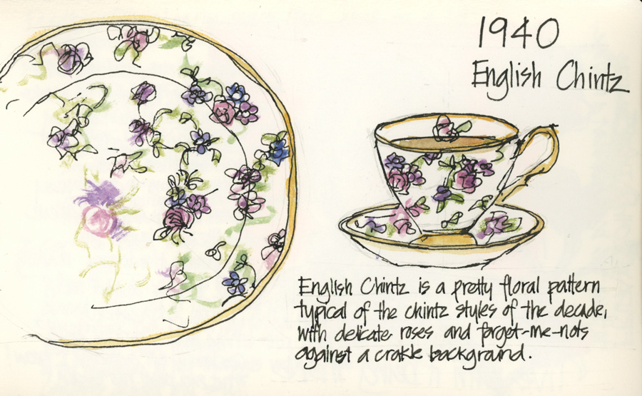 Ok…here we go again….my tea set (1950s-1990s) is only half of the special ‘100 years of Royal Albert’ set and so I feel like I have only completed half of the project. As my set came with a booklet describing all 10 designs and I have been able to find good enough pictures online…I am going to draw the remaining 5 decades.