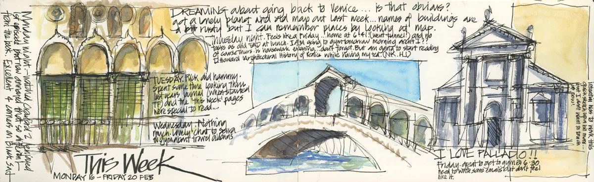 Anyway, this week the spread is very architectural. I am trying to decide where to go on my overseas trip this year – it was going to be a long 3 month adventure but now just looks like it will be a short one. I am longing to go back to Venice again. I had a wonderful week there in Jan 06 (before my sketching-on-location-days) and spent 3 months beforehand researching its architecture. I even prepared my own architectural guide! A bit rusty on some of the names but looking at a map brings back so many memories and a vivid picture of the spaces and buildings.