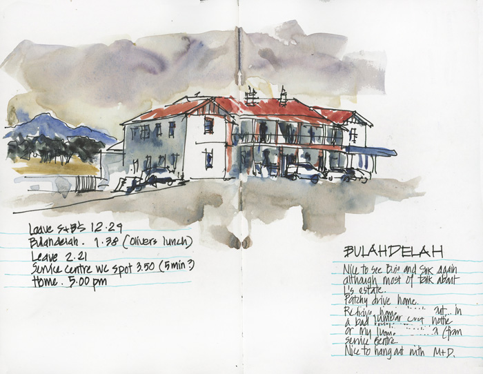 After a quick visit to my aunt and uncle (Dad’s brother), it was time for me to head home. This time I did manage a sketch on the drive south while I was waiting for my lunch order at Bulahdelah.