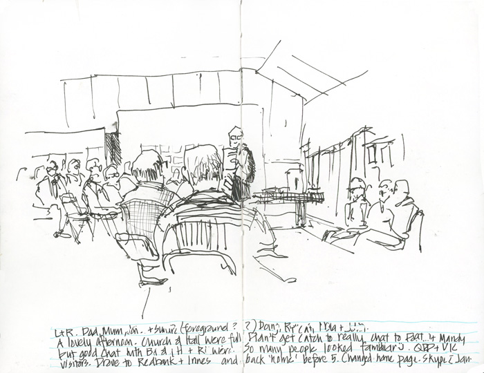 I then did this crazy loose sketch when we were all assembled in the hall. Someone to whom I spoke later in the afternoon thought it was weird that I was taking notes – not notes, just sketching, It was so lovely to catch up with lots of people from the country congregations of my church – many whom I hadn’t seen for years.
