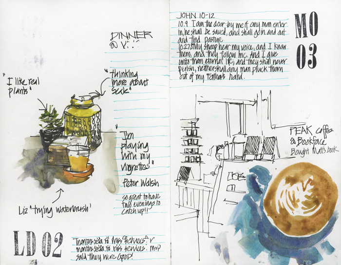 I had dinner with my friend again on Saturday evening, but this time I sketched the few objects on her coffee table while we were talking after dinner. I wrote down a few quotes too which will be a lovely memory for me in years to come. I find that the random trivial comments are the most enjoyable part of my sketchbooks when I look back at them years later. I remember the big things, but it’s the little things that I have forgotten which make my sketchbook records so special.