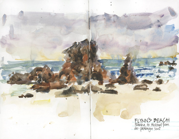 And then I did a quick stop at Flynn’s Beach for a sketch (from the car as it was raining).