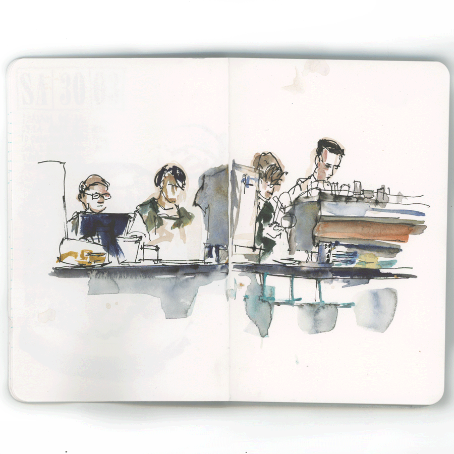 Last Saturday I tried to sketch the four people behind the counter at my Saturday cafe – Goodfields Eatery. This sketch took me 30 minutes and I didn’t even finish it. The insane amount of time (for me!) was due to the fact that my story was the ‘four behind the counter’ so I had to wait until there were no customers. Also one of the guys went for a break and the barista’s swapped positions. It was a bit frustrating but it made me realise that to do this challenge I can’t be concerned about sketching a specific person or group of people. Rather I just need to  sketch anyone who comes into my vision. So in this case, I would draw the steady stream of customers as well.
