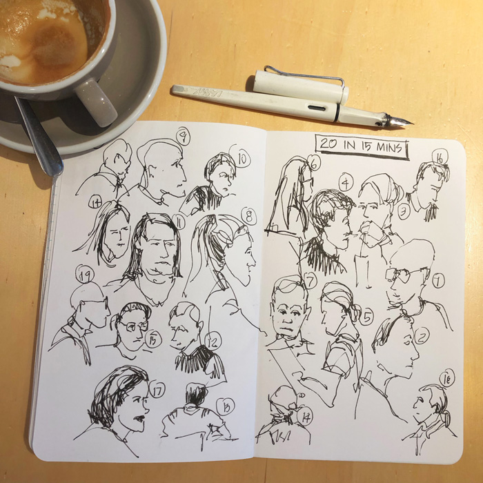 I know from previous years that it’s fairly easy for me to do 20 quick loose ink drawings of people (mainly heads) each day. This above page which I did a week or so ago, was a test to see how quickly I could do 20 such sketches. It only took me 15 minutes, but this was a crazy fast pace and the resultant sketches are a little too rough. But at least this test has given me a good feeling for time and if I wanted to do better versions I would allow 30 minutes.