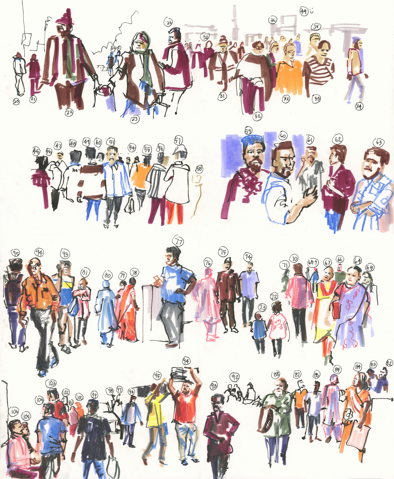 I wanted the second 100 to be looser and include more than just the head. So sketching crowds in India from paused videos was perfect. I didn’t have a plan when we started but after the first few sketches I soon got into a rhythm of randomly alternating between Inktense, Tombow and Fude lines.