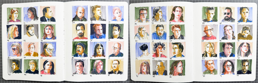 I hit 100 at 3:30pm on Wednesday but had to keep sketching faces until the next morning when I hit 120 and finished the 5 double page spreads in my book.