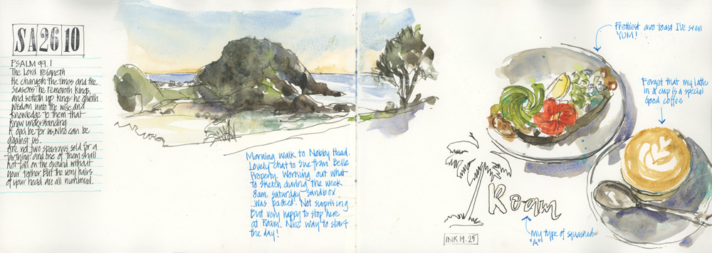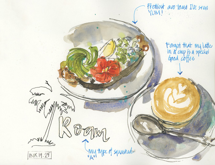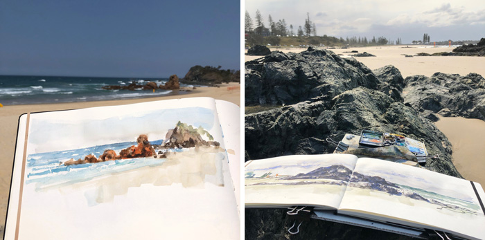 Two weeks ago I headed north to Port Macquarie for a little break. I had intended it to be a celebratory rest after finishing my online course – Watercolour On Location – but I extended the course by a few weeks, and had a week of work to do once I returned home. So it wasn’t quite the ‘unplug’ that I had planned, but it still was a wonderful break. I spent a lot of time catching up with friends and family, walking on the beach, hanging out in cafes, and only really used my phone for google maps and checking star rating for eating establishments.