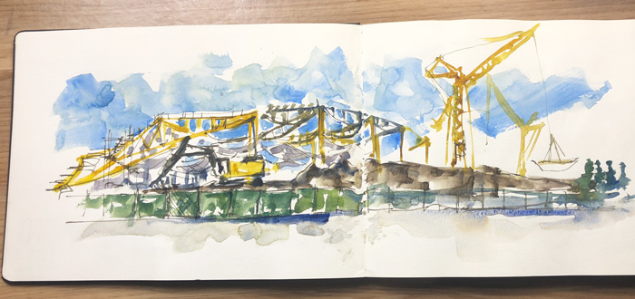 We had time to squeeze in one more sketch before Nina and Suhita needed to hit the road for school pickup. And so we stopped to sketch the latest Google campus under construction. We only had 30 minutes so this was a fun challenge.