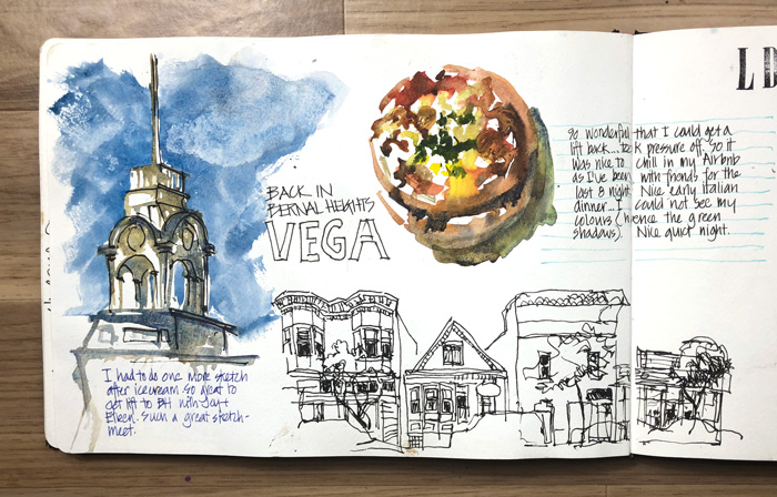 I did one final sketch of the back of the firehouse tower and then got a lift back to San Francisco – thanks Joy! I had a quiet evening (what!? really!) and a lovely dinner at Vega in Bernal Heights sketching in the dark.