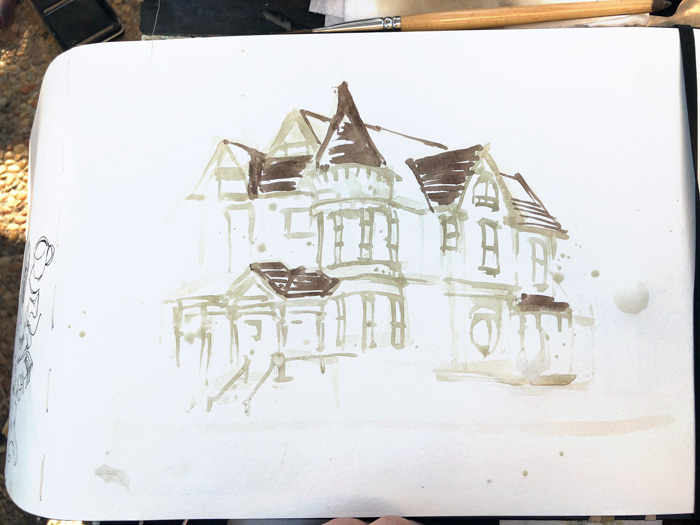 Then we met up with Nina Khashchina and Susan Wilson to sketch another Victorian – well technically this is a Queen Anne building. The lighting wasn’t great, but that didn’t stop me from trying out a new approach…