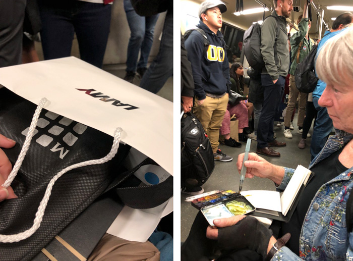 Laurie was still sketching on the BART ride home, but my lap was full of purchases and it was too hard to get my sketching gear out.