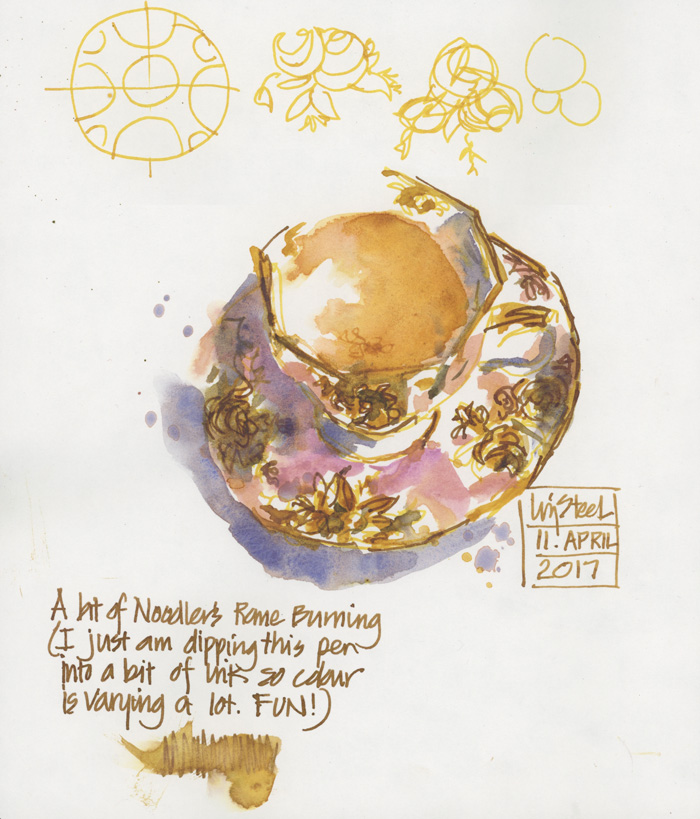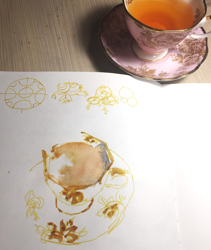 I love your teacup sketches Liz . I have a full bottle of Rome Burning…really unique ink I like to sketch with dip pen… I love ink in brown and sepia tones.