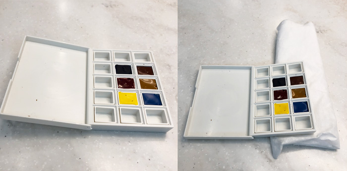 I believe it is noteworthy that the packaging doesn’t refer to a palette, rather it uses the term “travel case”. It really is a travel case and designed to do that well. I imagine to keep costs down their goal was to protect the paints and not try to be a palette. Daniel Smith is best at making paint and got out of the accessory business years ago. (Although I hear the palette they did have was legendary!) Since I already have almost all of your/my favorites in tubes I opted to get the “Inspiration” set and then add the colors I already have. I ordered a small folding Yasutomo palette to pair with this for less than $10 USD from Amazon. It is an awesome palette with lots of mixing space. I’m happy with DS focused on making FABULOUS paints 🙂