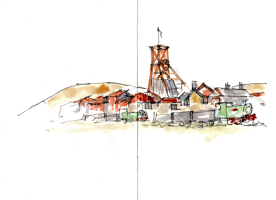 My first stop was the Big Pit Coal Mine – it was free!! But to go down you had to surrender anything with a battery – I caused a mild sensation by all my stuff – camera, mobile phone number 1 (iphone), mobile phone number 2 (cheap phone with UK sim card) Tom Tom (my Sat Nav), watch, car keys… I think that was it! I did attempt to do a few quick sketches while down in the pit – I wish I had started at the beginning but sometimes it is hard to know how long the guide is going to stop at each spot and whether the best spaces are at the beginning or end. The important thing is that I did TRY to draw underground.