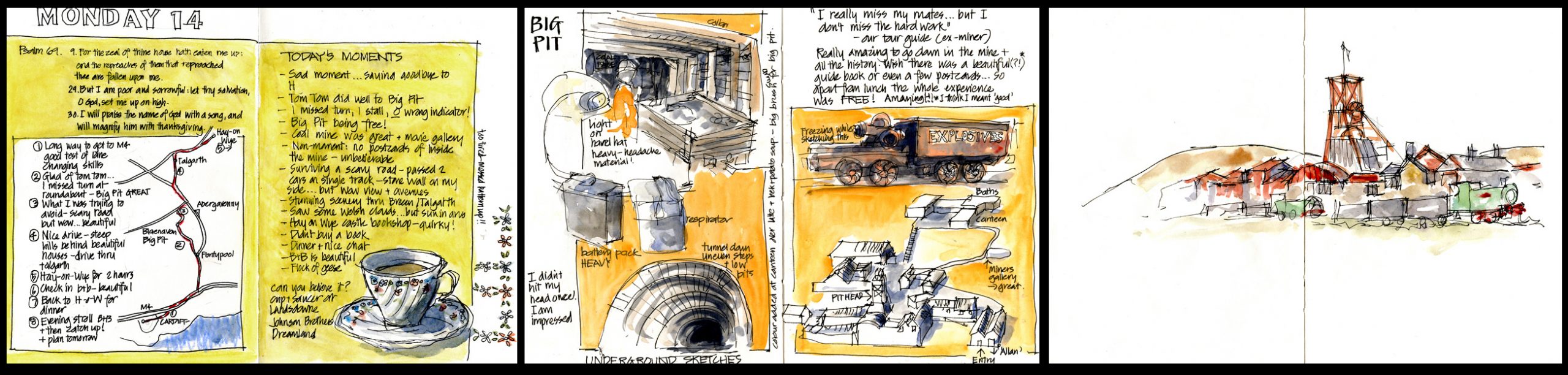 Monday – the start of the most adventurous part of my trip. 5 days solo travel through Wales. From leaving Cardiff Monday morning till Friday evening when I arrived at my friends place in Newcastle upon Tyne it was just me the Bear and my sketchbook. But I wasn’t ever lonely. This day, because I was sketching at dinner on my own, I had a lovely and lengthy conversation with a couple of decorators sitting at the table next to me.(see second combo)