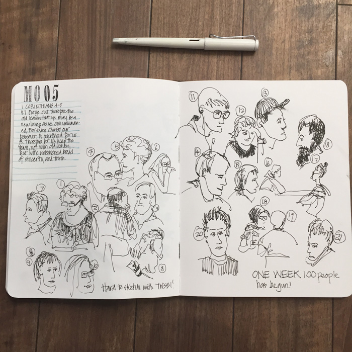 My first day was similar, 22 ink faces. Fortunately I had a meeting at the office so I sketched everyone several times. Today my goal is to sketch 20 people standing, sitting, walking. Maybe with brush or that might be the goal for tomorrow. I’ll have to go to the library or shops to see people as it is a work from home week.