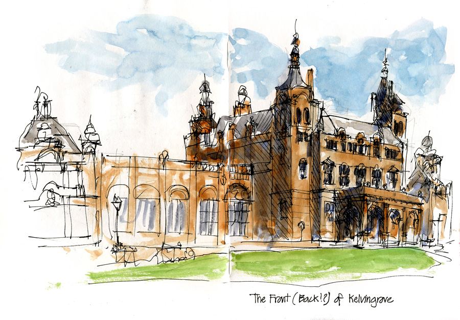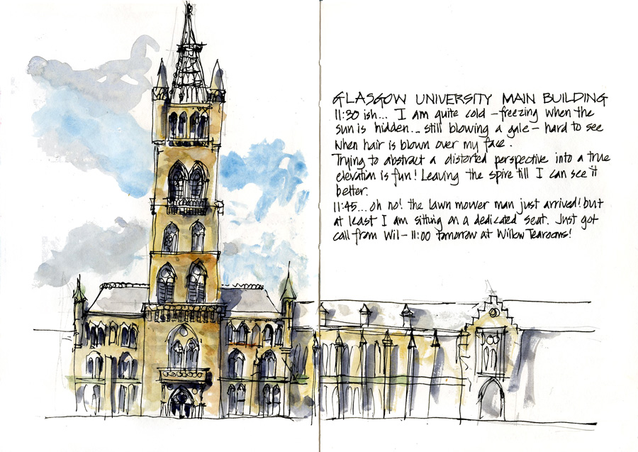 I only had about 30 minutes- furious sketching and then splashing of colour… Love this building and the red sandstone of Glasgow. Wish I had had more time to sketch it more slowly and the other side. Apparently the architect committed suicide when he realised that the building had been built back to front. The more fancy side is around the back.