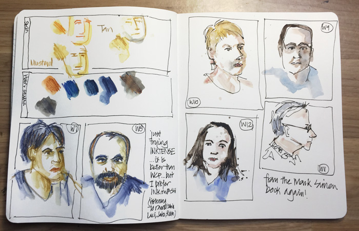Overall I was not that happy with my sketches this morning, so this evening I did a few tests back home, from photos. Testing Inktense pencils (after hanging out with Lynne who is the master of Inktense) and then a few sketches mixing ink and wash.