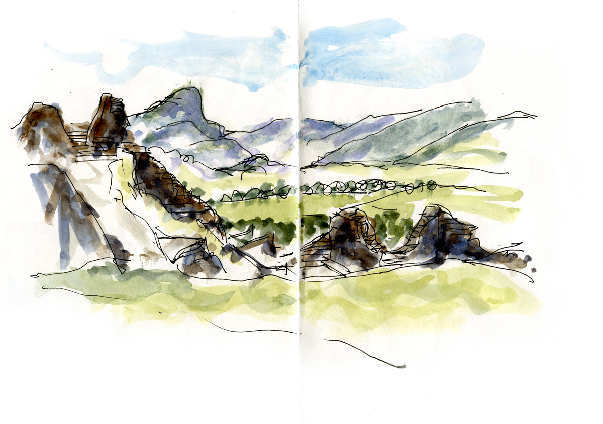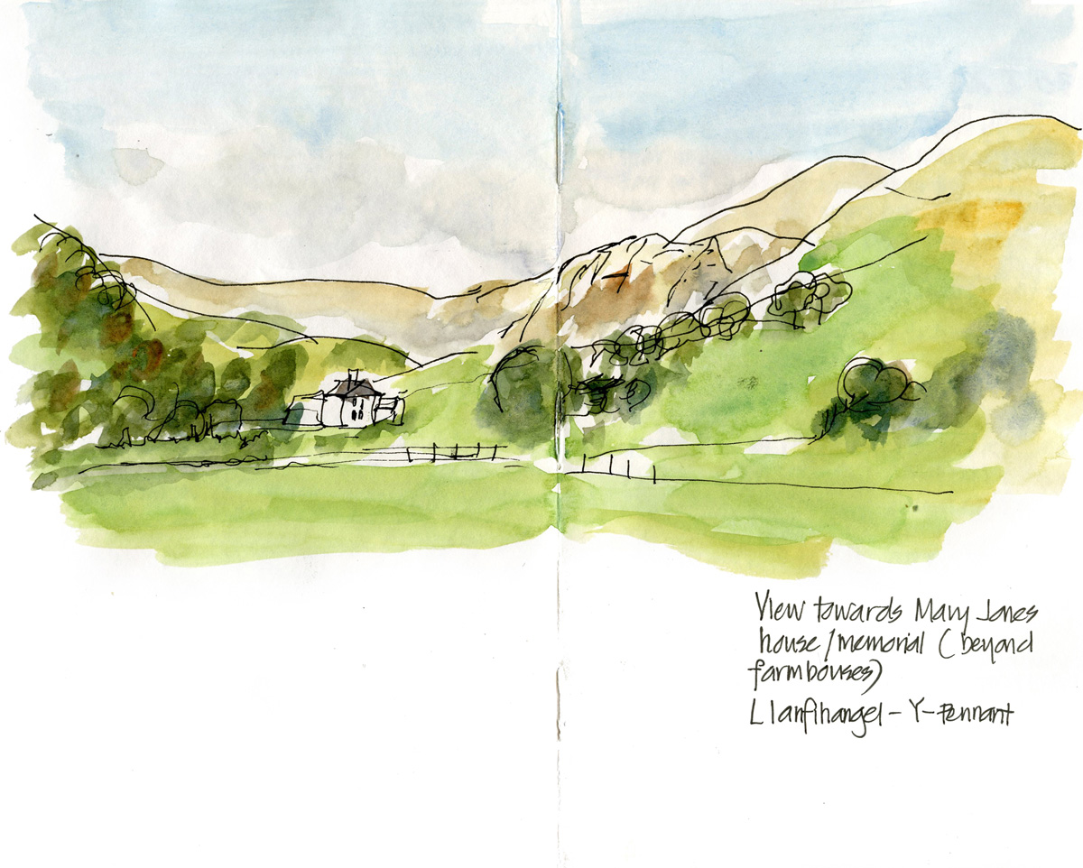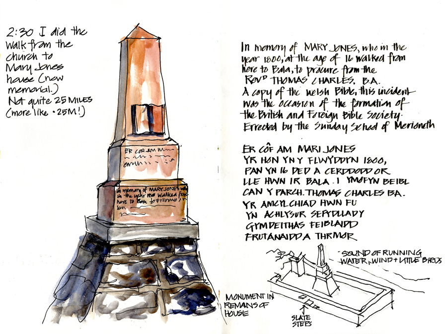 The story of Mary Jones and how she saved up for years and then walked 25 miles for a bible was something I grew up with. I had no idea that the valley in which she lived or the route she walked was so spectacular. It was also incredibly quiet. The village church was deserted and I felt a little weird going into it on my own and then I walked from the church to the remains of my home without seeing a soul. Really quick loose and wet landscape sketch and then a more careful one at the monument – was fun to write out the Welsh as well.