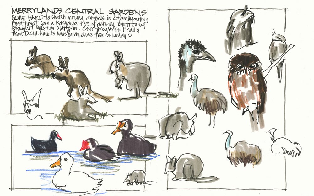 A few weeks ago I went to Merrylands Central Gardens Nature Reserve with a friend from Brazil (who had never seen a kangaroo before) and my brother’s family (four kids aged 8-14). I’m so amazed that this free mini zoo exists and impressed by how many Australian animals it contains. It was very hard to sketch at the time with the kids wanting to keep moving but I did manage these quick loose drawings at the time.