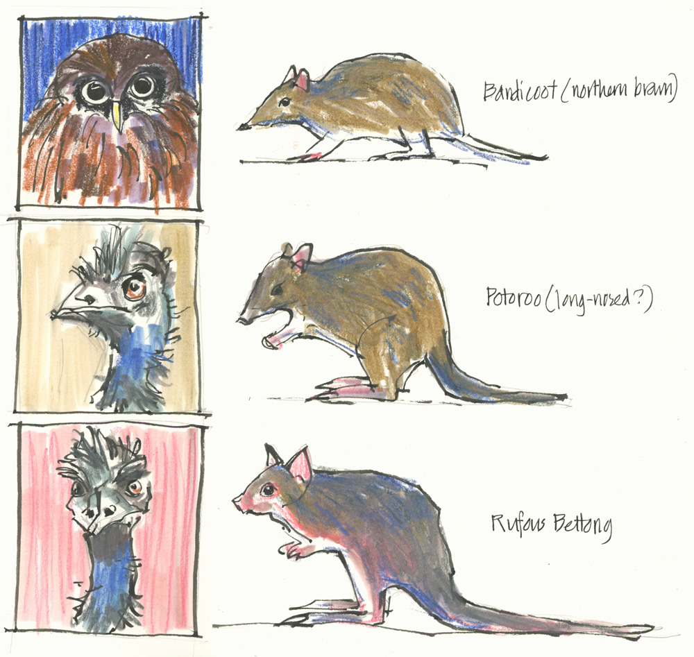Back home I did some sketches from photos. (Hmm, emus are lots of fun to draw and so are boobook owls).