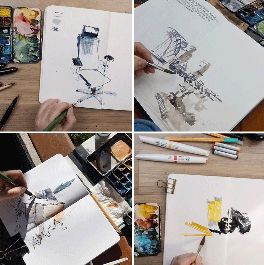 I really love the content in this course as it contains the concepts that I am constantly using when I sketch in ink and wash. It covers a very broad range of subject matter – sketching monuments, scenes with layers of trees and landscaping, streetscapes, workspaces, houses, food, teacups and even sketching faces.
