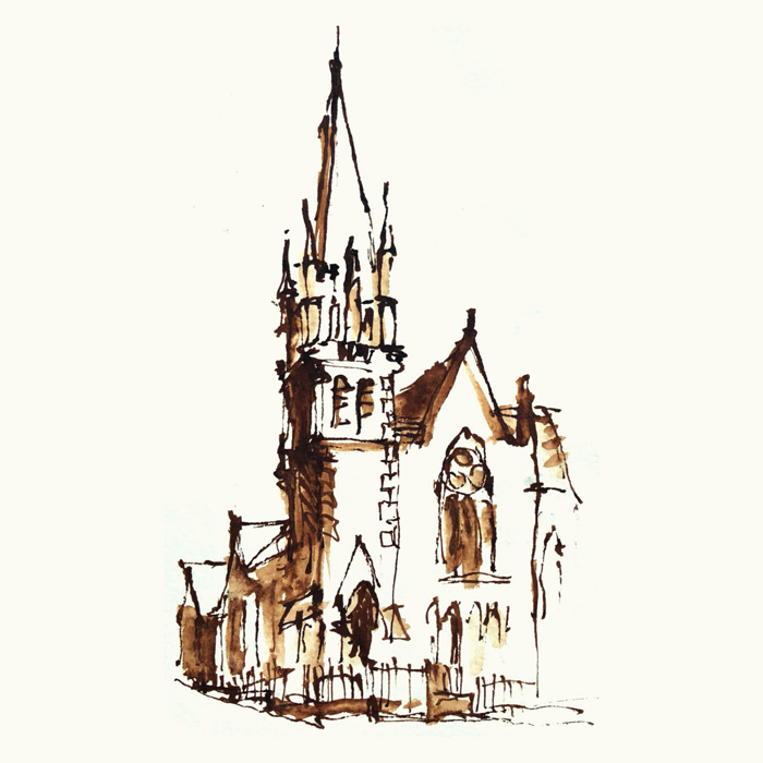 A quick view standing up of Martin’s Memorial Church using my Sailor Fude pen with Brown De Atramentis Document ink – yes, this is done with permanent ink! In order to create the shading, I was working super fast, so that I could move the ink with my waterbrush before it dried. In some ways I prefer using permanent ink rather than water-soluble ink for this type of sketch, as the ink which has dried doesn’t move, creating crisper lines.