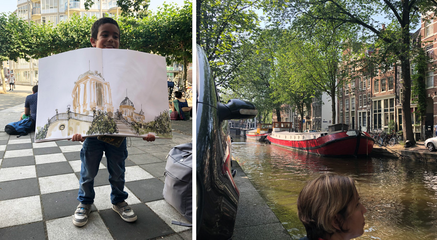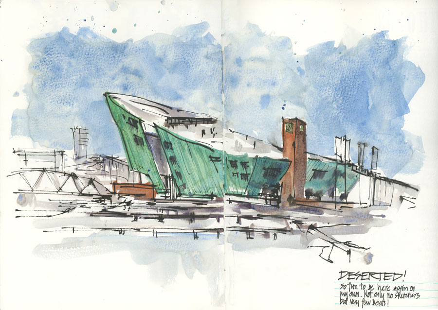 I want to finish this article with a sketch I did on the following Wednesday – my last evening in Amsterdam. I went back to the spot of the final sketchwalk and did another calmer sketch. Not only did it feel funny to be there without the hundred (thousands?) of other sketchers but there were very few boats as well. Even though I wrote the word ‘deserted’ in my book, it wasn’t a negative feeling. In fact the calmness of the environment and my sketching gave me a time to process all the amazing things that had happened during my stay in Amsterdam. A perfect way to end my visit.