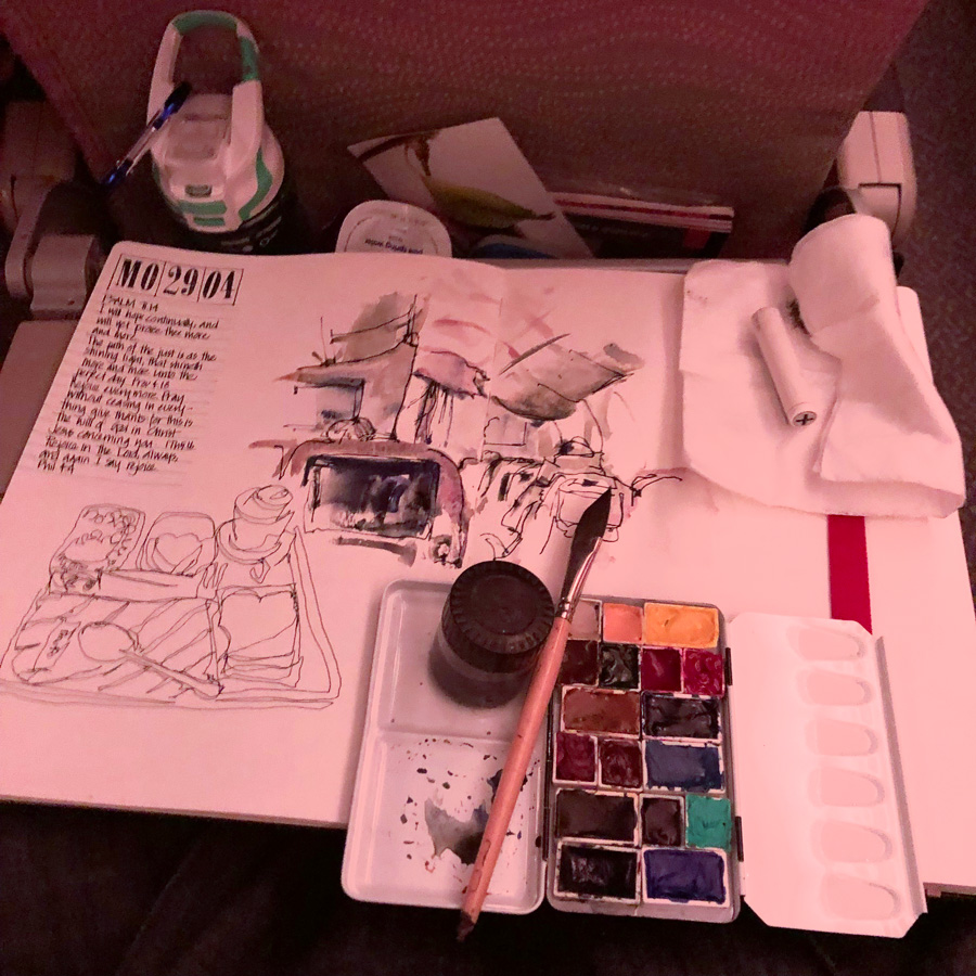 The A4 portrait format moleskine sketchbook was much better to use on the plane – it was actually narrower that the tray in my A380 seat.