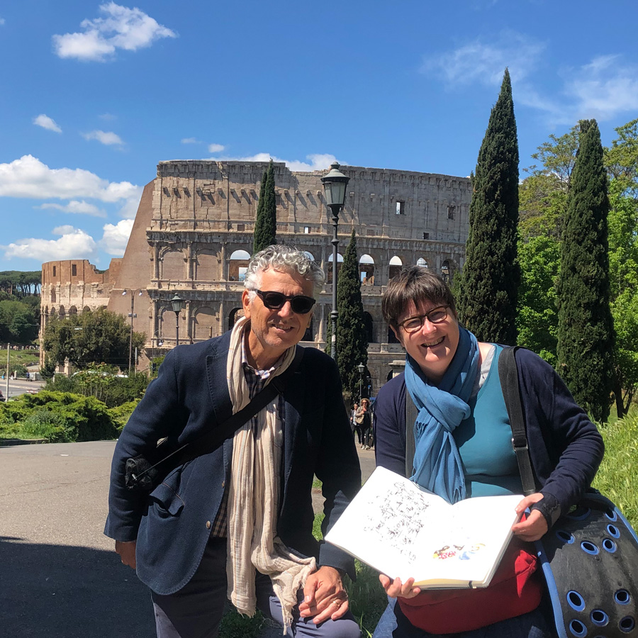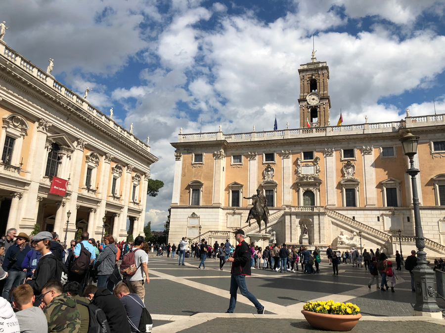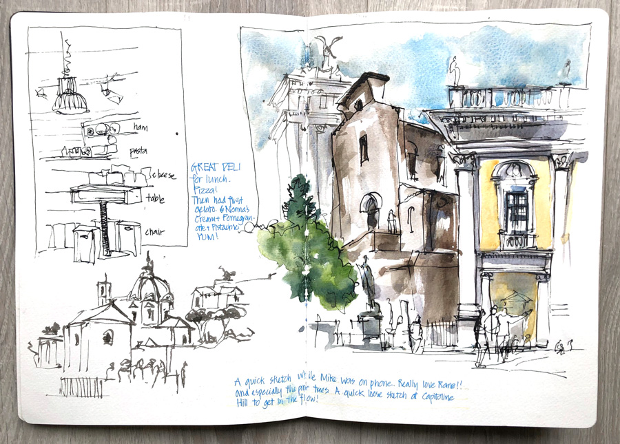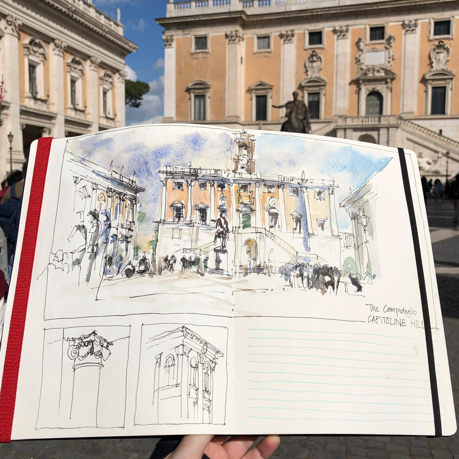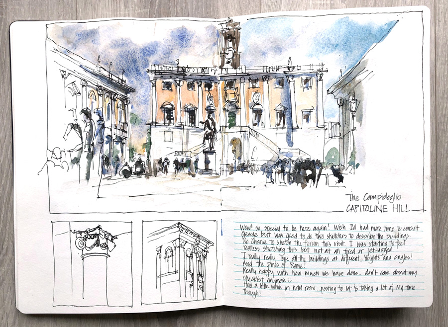 There is just too much to see and sketch, but we did stop at the Capitoline Hill to sketch the grand buildings/space by Michaelangelo. These are very special buildings to me and I was thankful that Mike was happy to sketch here.
