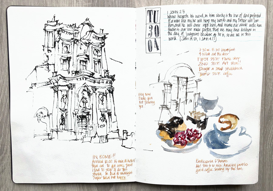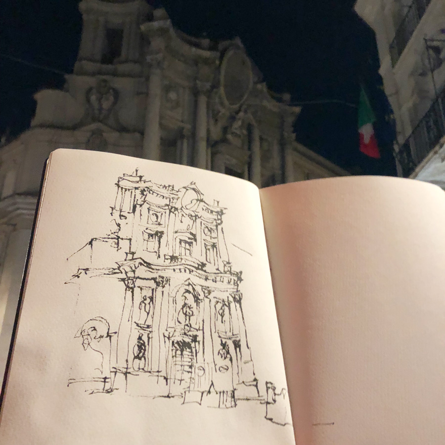 We arrived at the hotel at 10pm, dropped our bags and went out to get a bite to eat. We just so happened to pass my favourite Baroque building – San Carlo alle Quattro Fontane by Borromini. I had to stop and sketch even though it was after 10.30pm and I was very much sleep deprived! It was fun to have Mike with me, and that he pulled out his sketchbook as well.