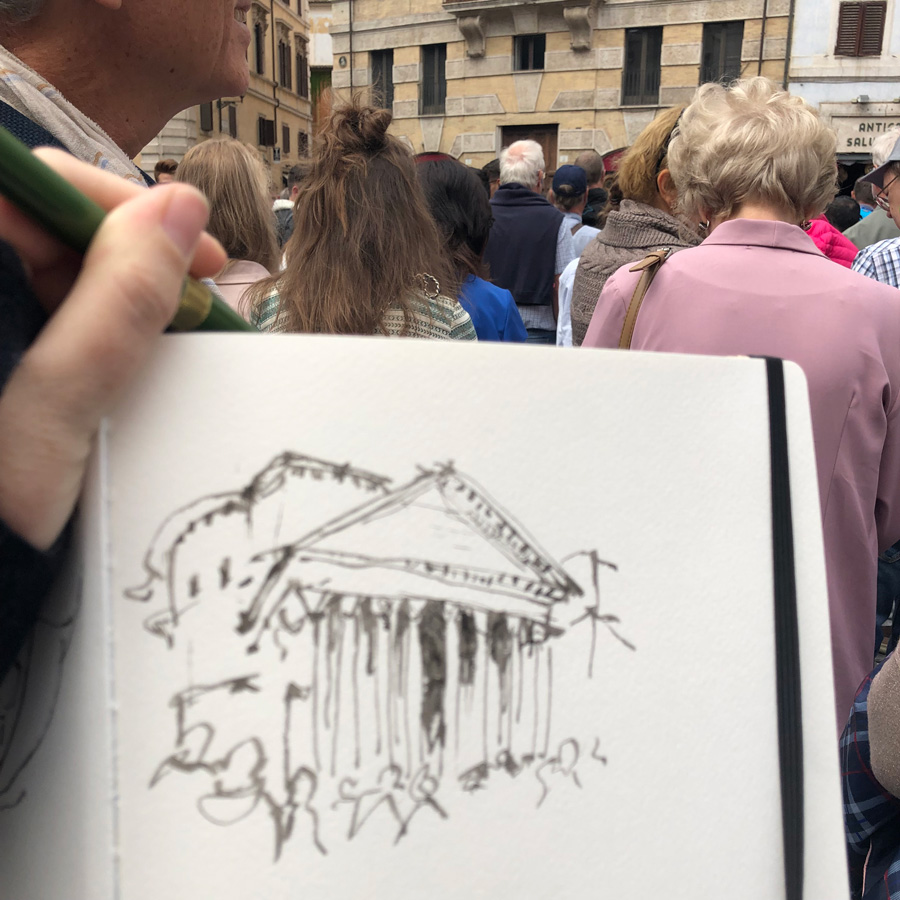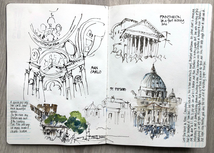 It was a public holiday (May Day) and there were so many people in Rome. There was a long but fast moving line to get into the Pantheon. Despite the moving line, I did a quick sketch. Sorry it is so blurry!