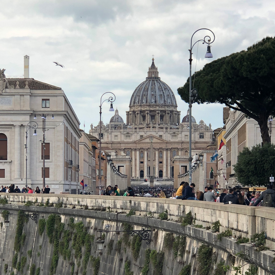 We ended up leaning against a wall sketching a flat view of St Peters (see my sketch below). It was crowded and noisy and not relaxing at all! But we still had fun.