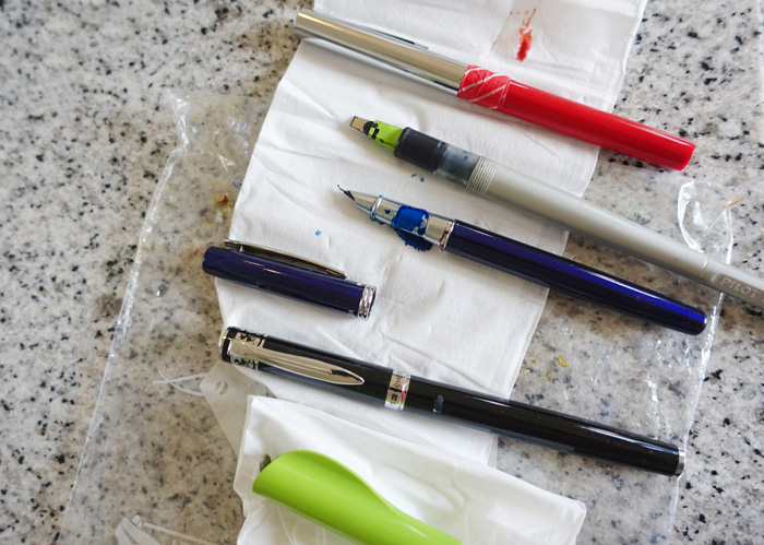 If you are unsure about a certain pen, or a little nervous about leakage, wrap a tissue around the pen and then put it in a zip-lock bag. On arrival, slowly take the cap off. This photo shows the result of the most leakage I have ever had.