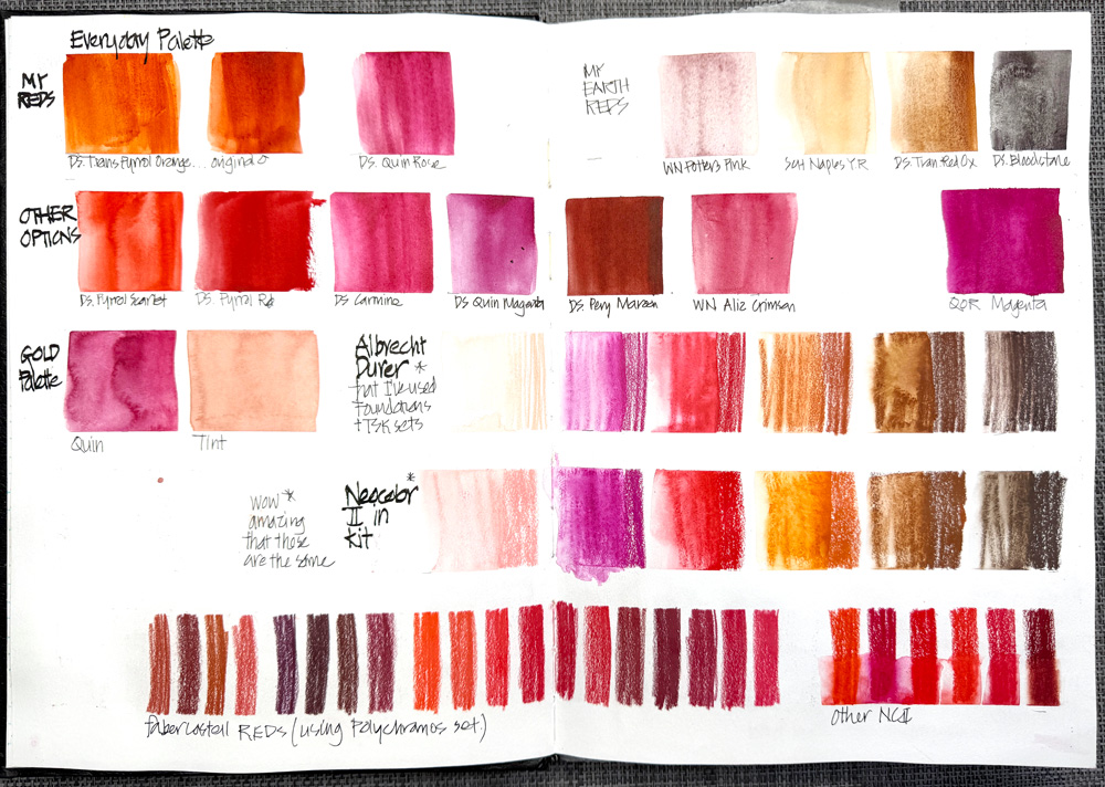 The first step in my Red month was to document all the reds I currently have in my kit (above) and to explore how far I could stretch red into adjacent hues (pinks, browns, maroons).