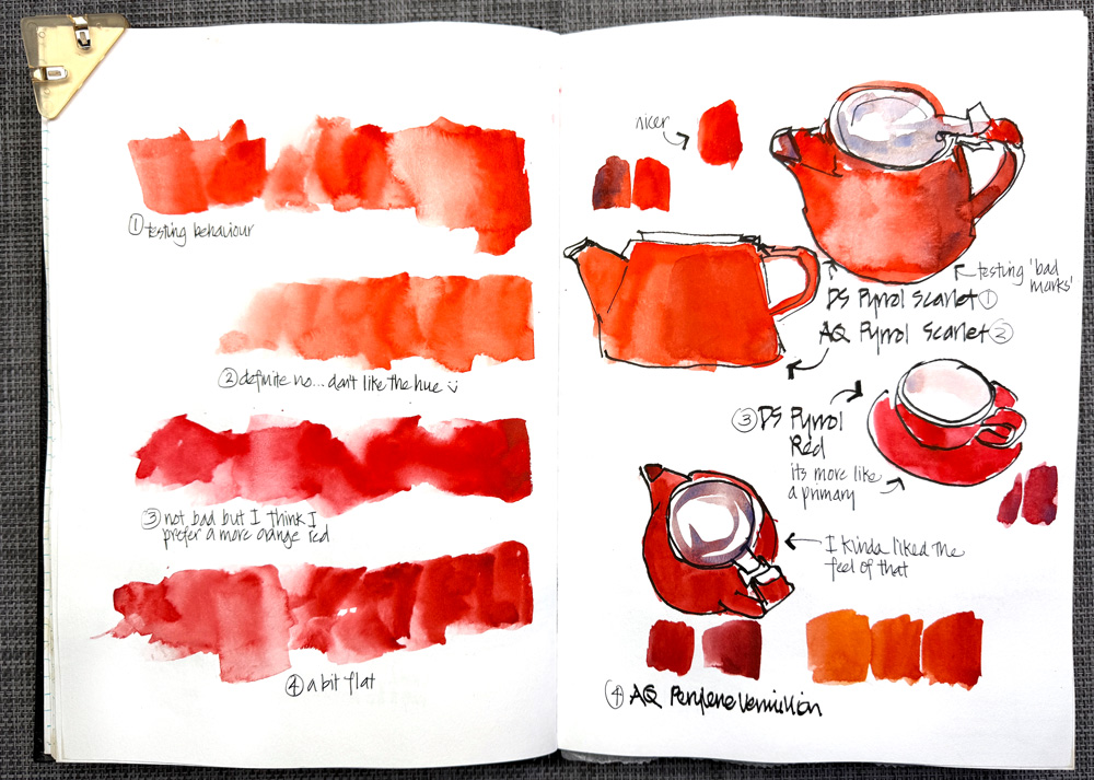 At the same time as I was doing these serious watercolour tests, I was also using red in every one of my morning sketches. (I set myself a goal of using red in every single double page spread in my sketchbook during December).