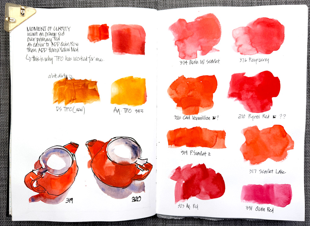 In addition I’ve been meaning to spend a little time looking into the change to Transparent Pyrrol Orange (TPO) and reviewing whether I should be using a different warm red in my palette. Something has changed in the manufacturing of TPO in recent years and it’s no longer a dark orange but more of a middle orange. It therefore isn’t as useful as a warm red.