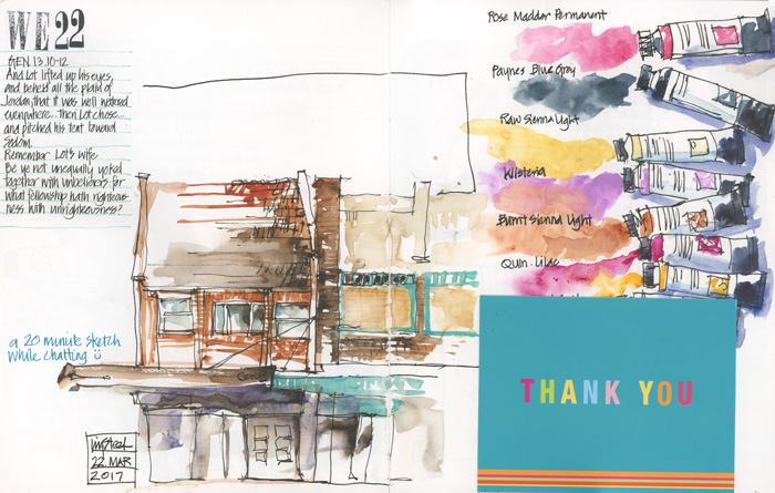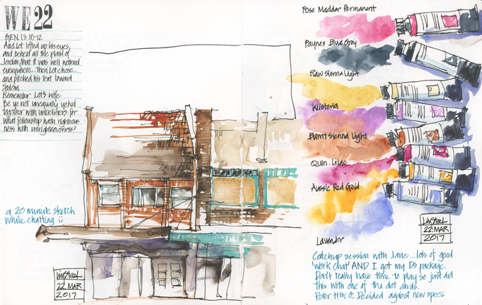 I haven’t had a chance to set aside the time to do a new sketch this week, but what I thought I would share is thisĀ 20 minute sketch of a local shop in my area that I did sitting next to Jane Blundell last week (and chatting a bit at the same time too!) I knew I didn’t have a lot of time but I just started and had fun mixing up line and colour and seeing how far I would get before my alarm went off. I started with the wierd asymmetrical roof of the shop on the left and the juxtapostion of it with the more decorative shop on the right.