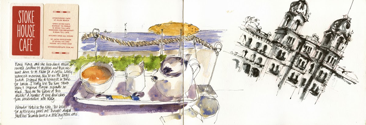 Unscheduled coffee (or tea in my case) with Marguerite at Stoke House Cafe. Love seeing my granulating paint mixes go crazy on the page. Quick lunchtime sketch in the rain with some of the Melbourne sketchers in the rain using a watersoluble pens- the Windsor Hotel